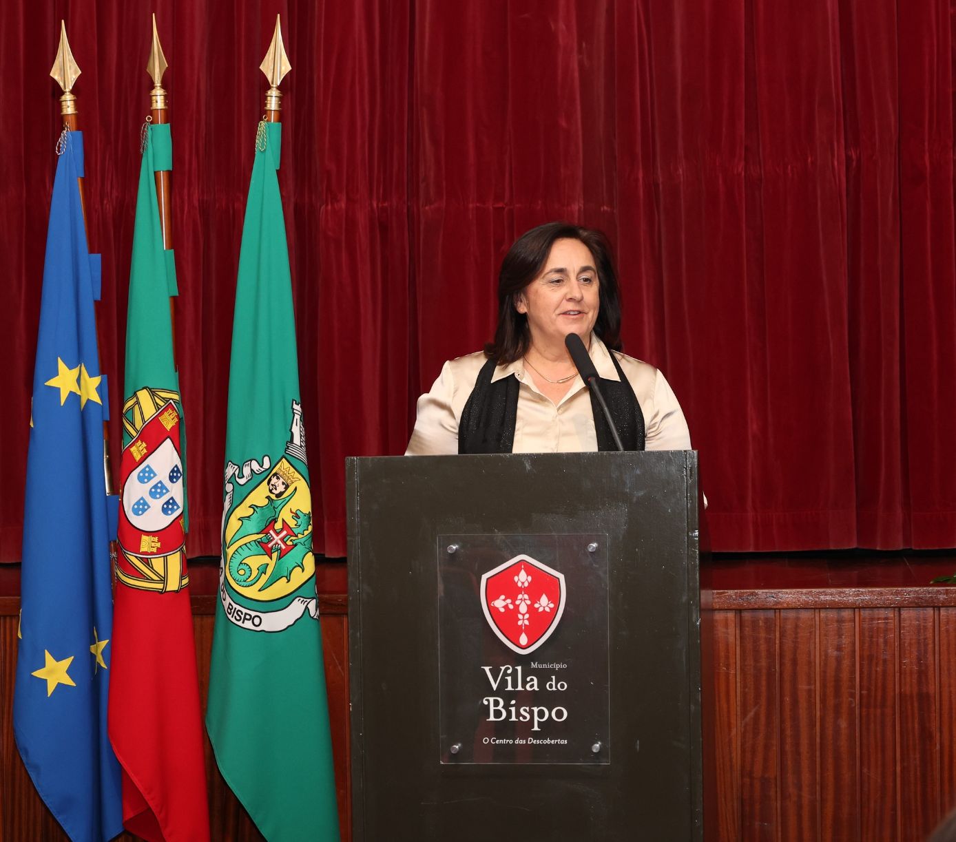 Seguiu-se a sessão solene da Assembleia Municipal, que decorreu no Auditório do Centro Cultural e contou com a presença de entidades locais e regionais, forças militares e militarizadas, do presidente da Comissão de Coordenação e Desenvolvimento Regional do Algarve, José Apolinário, e da presidente da Assembleia Municipal de Lagos, Paula Couto. A sessão integrou ainda um momento cultural, protagonizado pelos alunos da secção de sopros da ALMA – Associação Livre – Música e Artes de Vila do Bispo.