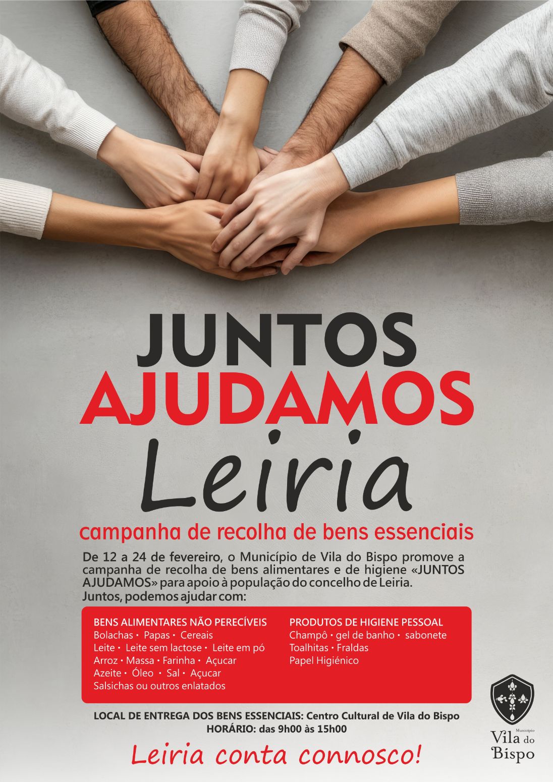 O município de Vila do Bispo está a promover, até ao próximo dia 24 de fevereiro, a campanha de recolha de bens alimentares e produtos de higiene “JUNTOS AJUDAMOS” com o objetivo de apoiar a população do concelho de Leiria.
