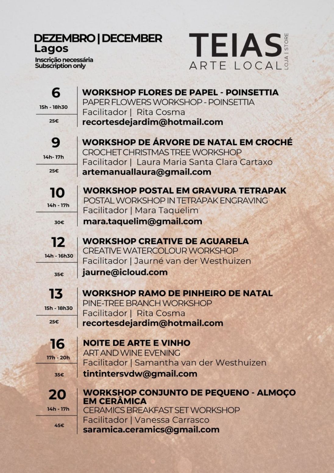 Entre as atividades estão os workshops de flores de papel – poinsettia; árvore de Natal em croché; postal em gravura tetrapak: aguarela; ramo de pinheiro de Natal; Noite de arte e vinho; e conjunto de pequeno-almoço em cerâmica.