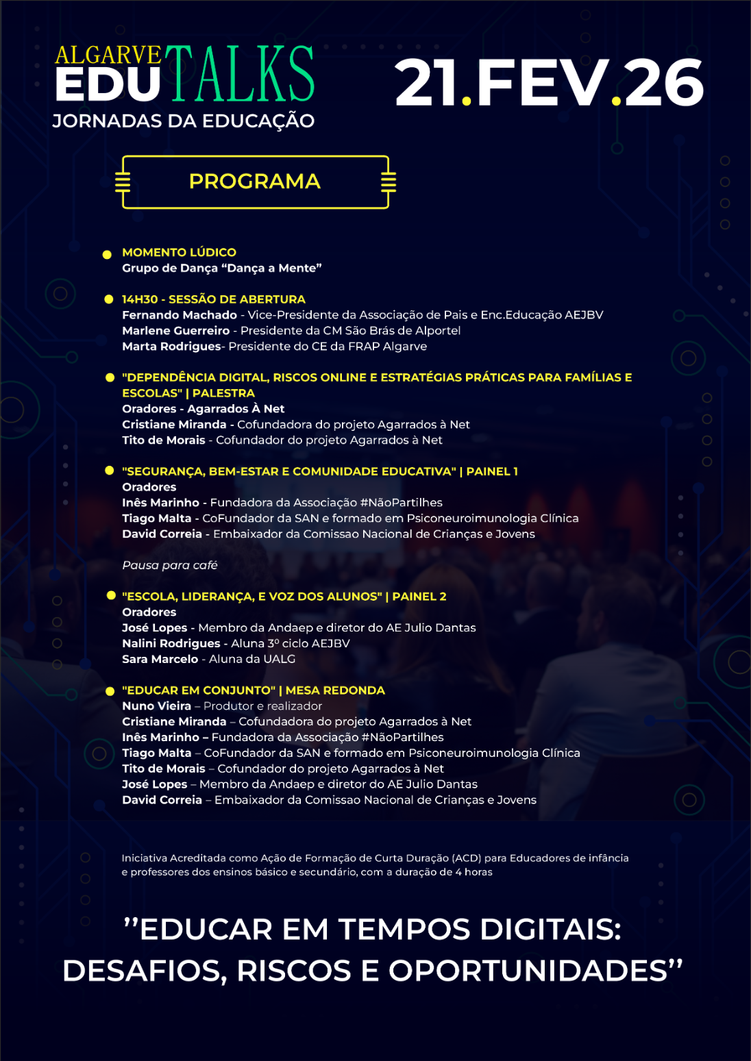 A iniciativa encontra-se acreditada como Ação de Formação de Curta Duração (ACD) para educadores e professores dos ensinos básico e secundário, constituindo uma oportunidade de formação e atualização em temáticas emergentes e socialmente relevantes.