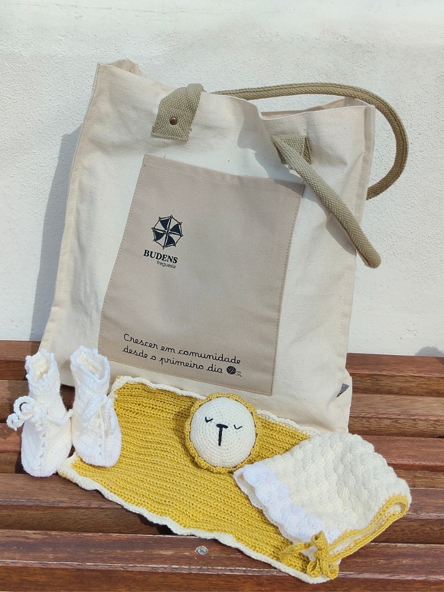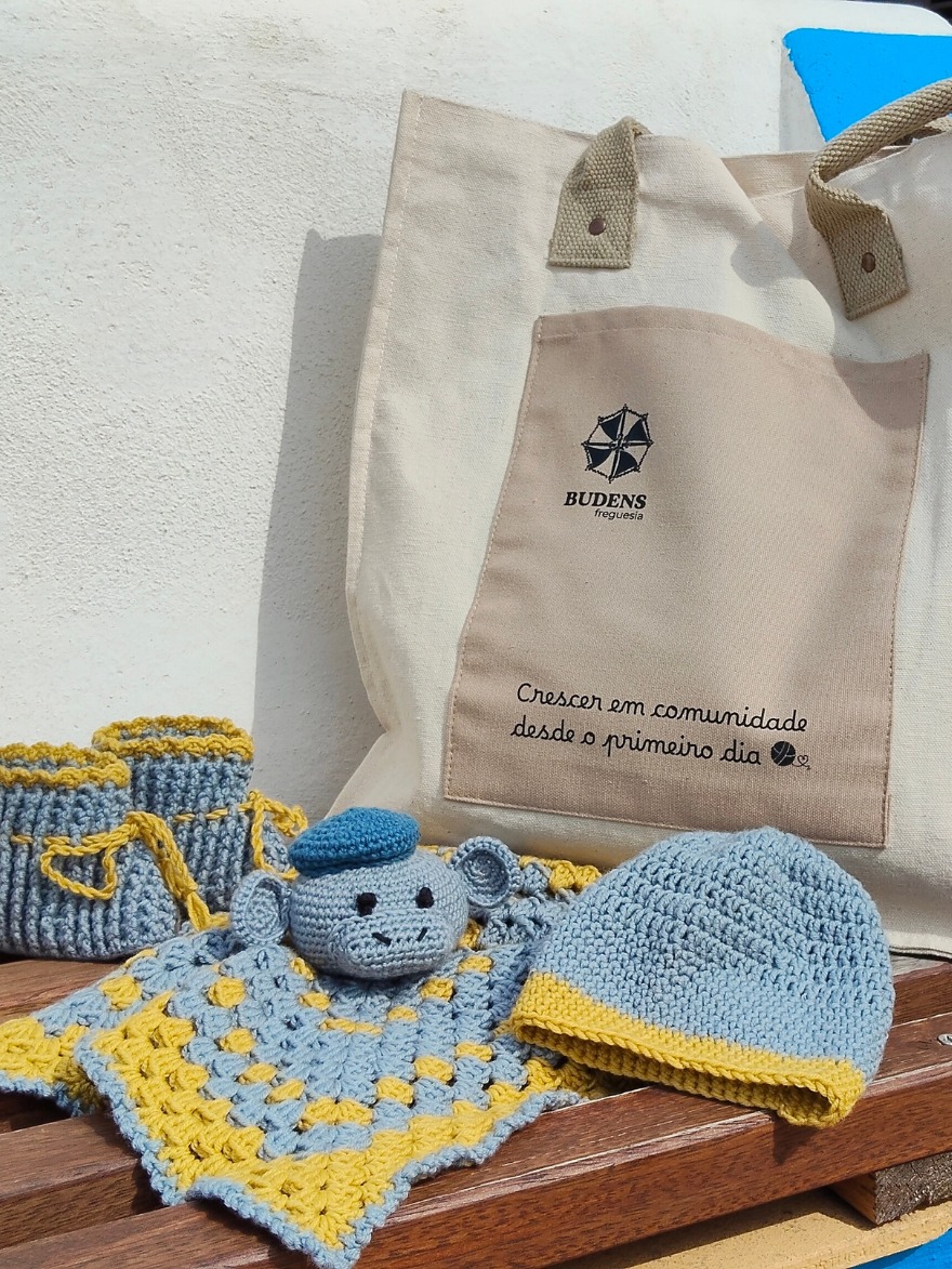 Os kits resultam do trabalho e dedicação do Clube de Crochet de Budens, cujas participantes confeccionam à mão várias peças para oferecer às novas famílias. Cada conjunto inclui peças de crochet preparadas com tempo e cuidado, um saco para a mãe com a frase do projeto — “Crescer em comunidade desde o primeiro dia” — e ainda um creme muda fraldas e um sabonete de cosmética natural, gentilmente oferecidos pela artesã local Marta Dinis, da marca O’de Oliva.